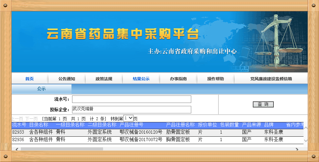 (武漢克瑞普骨科耗材在云南省藥品集中采購項目成功掛網(wǎng)產(chǎn)品展示截圖)