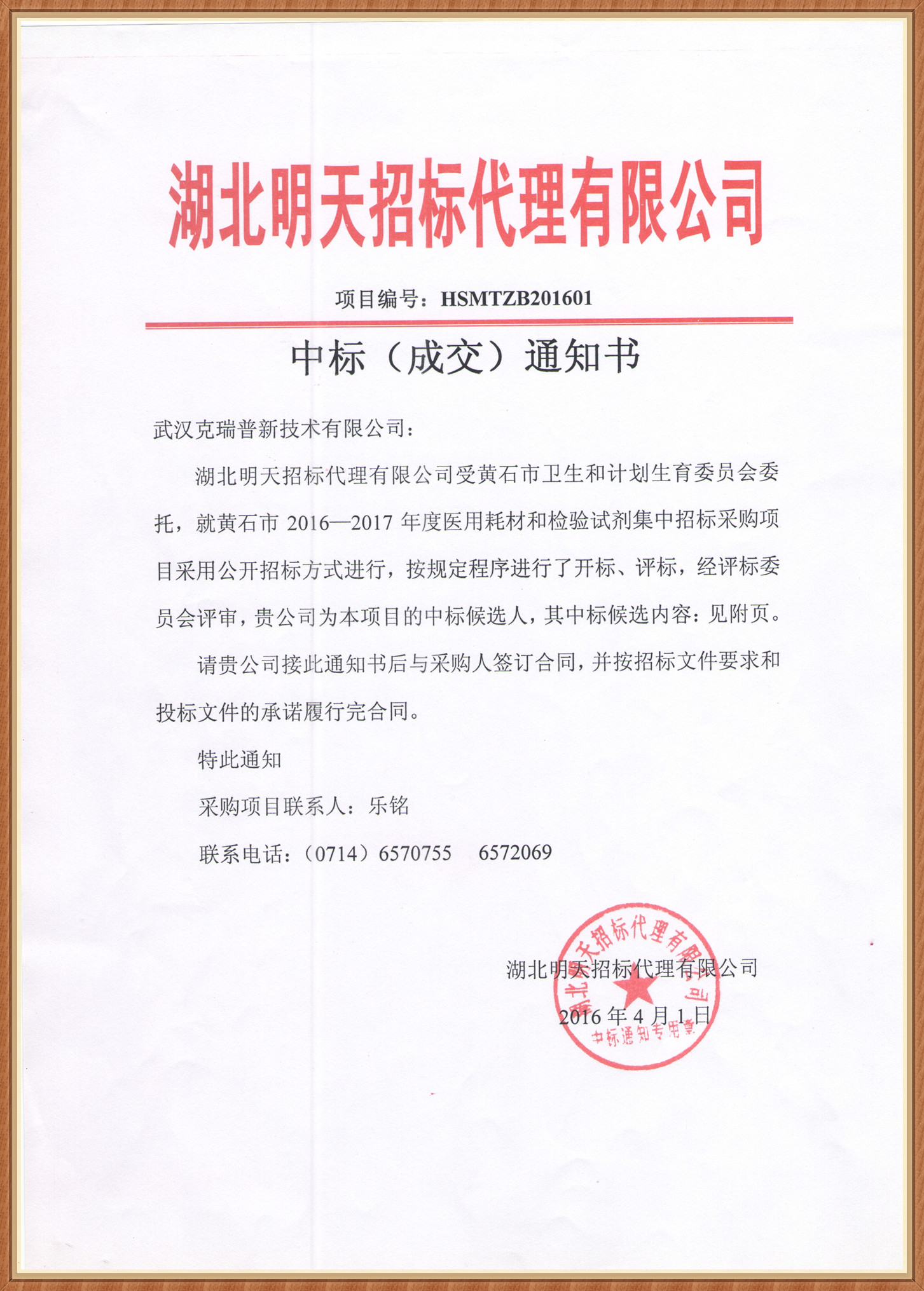 【湖北省黃石市醫(yī)用耗材和檢驗試劑集中招標采購中標通知書】武漢克瑞普新技術(shù)有限公司在黃石市2016-2017年度醫(yī)用耗材和實驗試劑集中招標采購項目中按程序進行評標以及評標委員會的評定已成功中標,我們在本次采購中標了肋骨固定板(規(guī)格:140*180*3.0 型號:A2型)以及胸部護板(規(guī)格:16*18 型號:A1型)兩種骨科耗材產(chǎn)品。