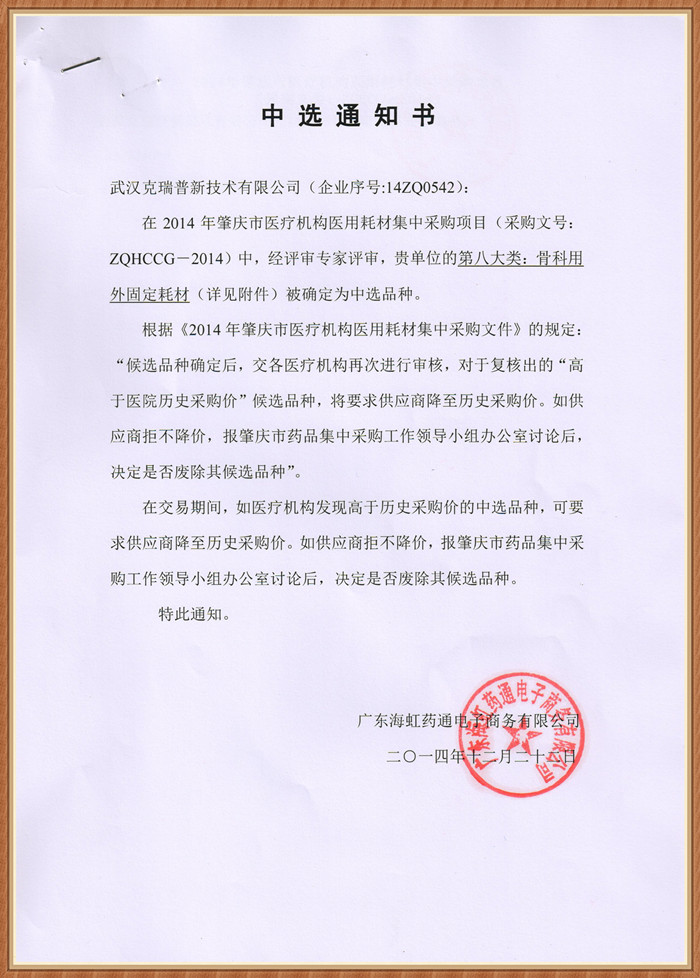 【廣東省2014年肇慶市醫(yī)療機構醫(yī)用耗材集中采購項目中標通知書】武漢克瑞普新技術有限公司(采購文號:ZQHCCG-2014)中我們公司生產(chǎn)的骨科用外固定耗材產(chǎn)品已成功中標,我們的骨科耗材產(chǎn)品種類較多,全部為一類的骨科耗材產(chǎn)品歡迎各大經(jīng)銷商與我們?nèi)〉寐?lián)系。