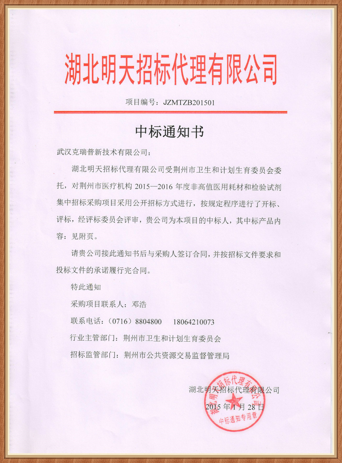【湖北省荊州市2015-2016年度非高值醫(yī)用耗材和檢驗(yàn)試劑集中招標(biāo)采購中標(biāo)通知書】武漢克瑞普新技術(shù)有限公司在荊州市醫(yī)療機(jī)構(gòu)非高值醫(yī)用耗材和檢驗(yàn)試劑集中招標(biāo)采購項(xiàng)目中我司經(jīng)評標(biāo)委員會的評審決定成功獲得了中標(biāo)的資格,我們本次中標(biāo)的產(chǎn)品是我廠家較為關(guān)注的一款產(chǎn)品那就是我們的東科圣康品牌的胸腔固定夾板產(chǎn)品,這款產(chǎn)品在醫(yī)院以臨床使用中較為良好,我們歡迎各大經(jīng)銷商與我們?nèi)〉煤献鳌?/span>