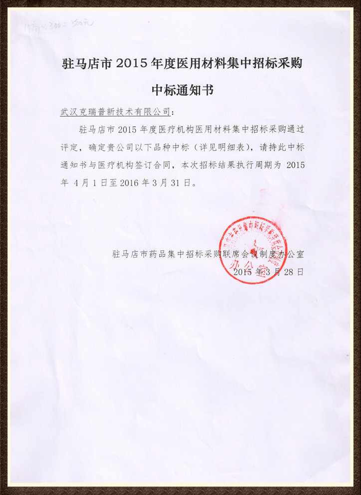 【河南省駐馬店市2015年度醫(yī)用材料集中招標(biāo)采購中標(biāo)通知書】我們在駐馬店市醫(yī)療機(jī)構(gòu)醫(yī)用材料集中采購項目中我們的東科圣康品牌胸腔固定夾板成功成為中標(biāo)產(chǎn)品,產(chǎn)品為胸骨肋骨受傷骨折需要外固定的患者使用,能降低患者胸骨部位受傷造成的疼痛緩解患者的呼吸不會導(dǎo)致因受傷而造成的胸部壓迫感。